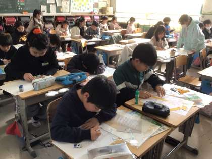 表面がざらざらした紙やビニールのプチプチ等いろいろな材料を使って、自分の表したいものを楽しんで作っていました。