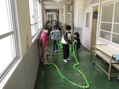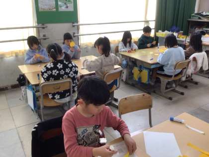 もうすぐ3月。卒業を迎える6年生に向けて、2年生が飾りを制作しています。