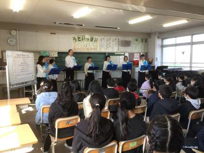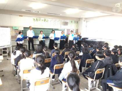 合唱やミュージカル等、幅広く活動していらっしゃる「コール結」の皆様が本校へお越しくださり、6年生の子どもたちに合唱のプレゼントをしてくださいました。