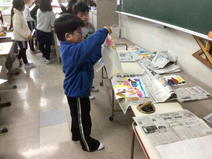 3月3日 図画工作科(1年生) 公開日 2025/03/03 更新日 2025/03/03 校長室から 1年生が、制作した紙版画の印刷を行なっていました。 版に紙をのせてこすると色鮮やかに刷り上がりました。 作品を嬉しそうに見合っていました。