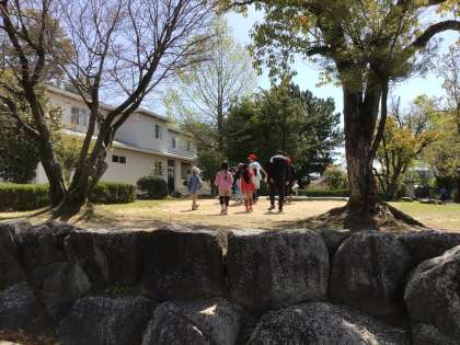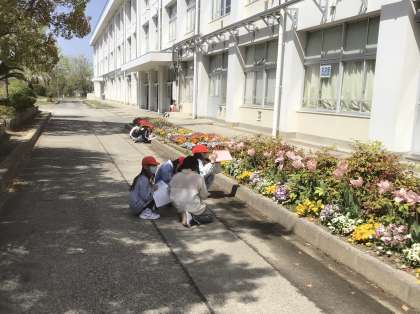 子どもたちが、理科や生活科の学習で、校庭に出て「春見つけ」を行っていました。