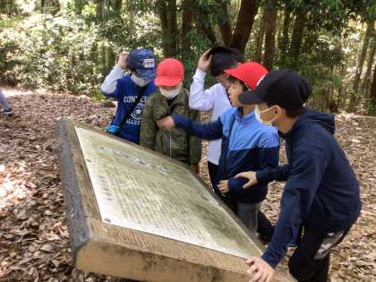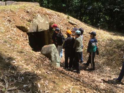 5月8日 社会科校外学習(6年生) 公開日 2025/05/08 更新日 2025/05/08 校長室から 6年生が、平戸橋町の馬場瀬古墳群へ見学に出かけました。 市の学芸員の方々が現地に来てくださり、古墳群の説明をしてくださいました。子どもたちは熱心に話を聞き、地形を確かめたり看板を読んだりして学びを深めました。平戸橋自治区の皆様の温かいご協力により、地域の遺跡に実際に触れる大変よい機会となりました。