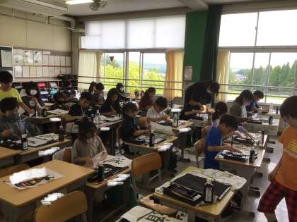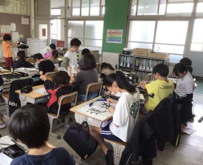 5年生が、習字で「道」を書いています。
