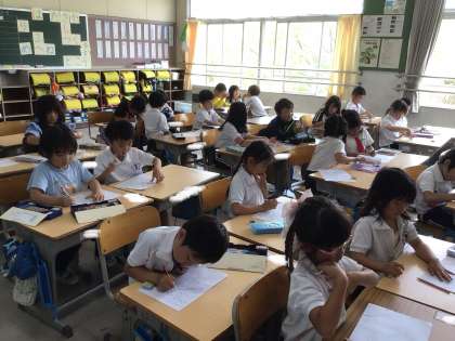 1年生が、ひらがなの練習に励んでいます。今日は「な」の字を形に気をつけながら練習していました。