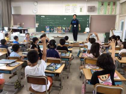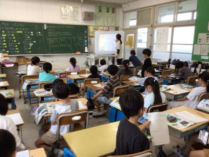 2年生が図工で制作した作品の鑑賞を行っていました。作品の色づかいやデザインの良さなど、意見交流をしていました。