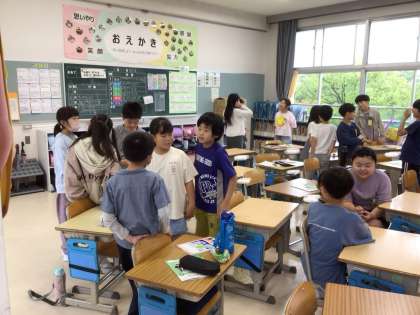 4年生が、朝の活動で、連想の会話を楽しんでいました。グループで互いに考えを出し合って楽しく会話をしていました。