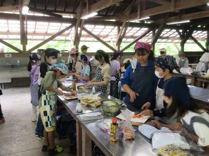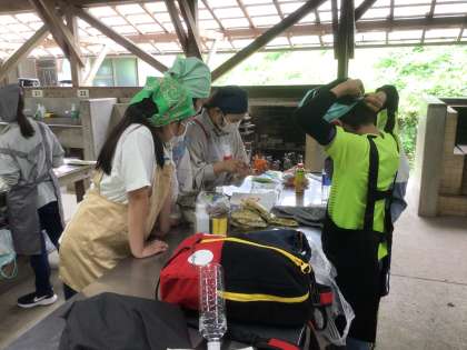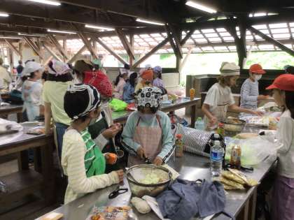 子どもたちが、グループごとに食事の用意を協力して行っています。