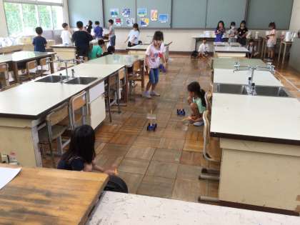 理科では、「ゴムと風の力のはたらき」の学習で、ゴムの力で車を動かしながら、どのくらい進むか距離を確かめる実験をしていました。
