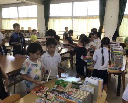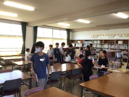 今朝は、8組、9組、6年生、2年生の子どもたちが本を借りに訪れていて、本を手に取ったり、相談したりしながら本を選んでいました。