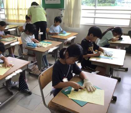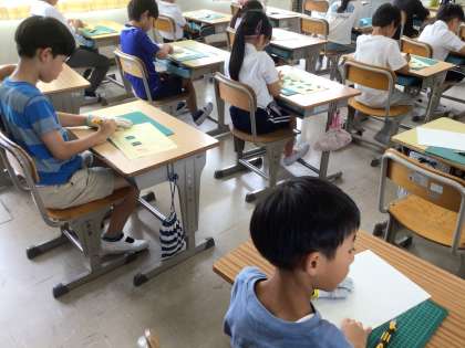 図工では、カッターナイフの使い方を学び、いろいろな線や形を丁寧に切り取っていました。