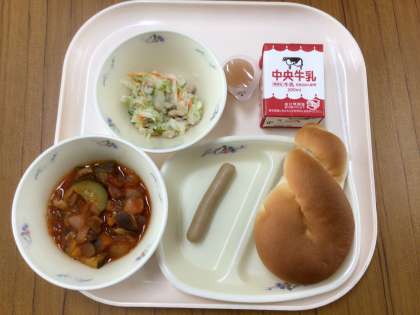 今日の給食の献立は「ツイストパン、牛乳、ラタトゥイユ、とよたひまわりポーク入りウインナー、ビーンズサラダ、ももゼリー」の豊田ブランドの日献立でした。
