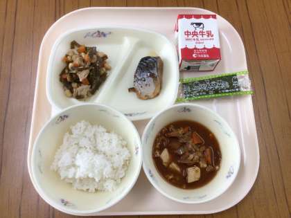 今日の給食は「ごはん、牛乳、さばの煮つけ、五目豆、なめこのみそ汁、味付けのり」で、はしの使い方を確認できるメニューでした。切る、つまむ、はさむ、くるむなど、料理に合わせてはしを上手に使えると素敵ですね。