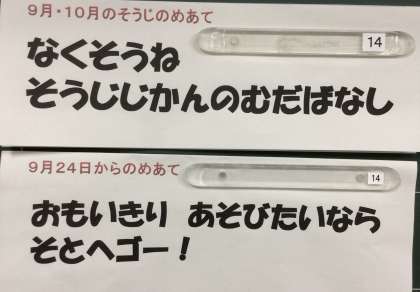 今日からの美化のめあては「なくそうね そうじのじかんの むだばなし」、生活のめあては「おもいきり あそびたいなら そとへゴー」です。