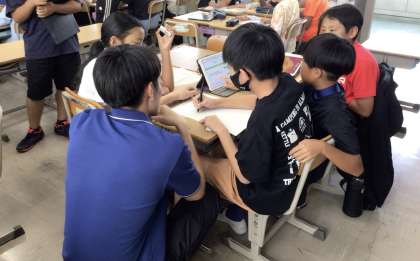 グループで調べたり考えを出し合ったりして、熱心にクイズを作っていました。サポーターとして大学生の方も来てくださり、子どもたちの活動を支援してくださいました。