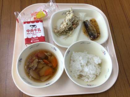 今日の給食の献立は「ごはん、牛乳、いわしのしょうが煮、ごぼうサラダ、いものこ汁、月見だんご」の十五夜献立でした。