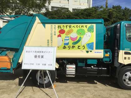 豊田市循環型社会推進課の方が表彰のために学校に来てくださり、作品をラッピングしたパッカー車を披露してくださいました