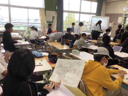 図工では、お話から想像を広げて下絵を描いたり、彩色の工夫を確認したりしていました。