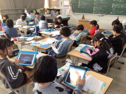 道徳科では、世界の国について学習用タブレットを使って調べ、まとめをしていました。