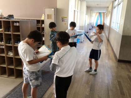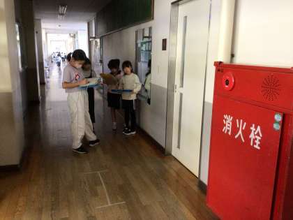 社会科では、学校の防火施設について、グループで探しながら確認していました。