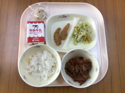 【献立】ごはん・牛乳・めひかりフライ・煮みそ・青菜あえ・おにまんじゅう