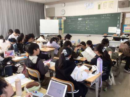 11月28日 算数科(5年生) 公開日 2025/11/28 更新日 2025/11/28 校長室から 5年生が、算数で「単位量あたり」の学習に取り組んでいます。 学習した箇所を算数の友を使って互いに教え合いながら復習していました。