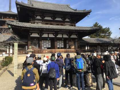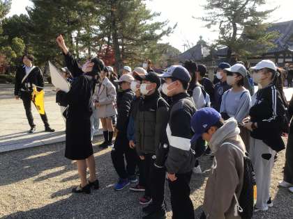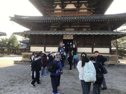 12月2日 修学旅行4 公開日 2025/12/02 更新日 2025/12/02 学校行事 最初の見学地、法隆寺へ到着しました。 バスを降りてから少し歩きましたが、暖かく、紅葉がとてもきれいでした。 日本最古の木造建築である法隆寺を、学級ごとにゆっくり見学しました。