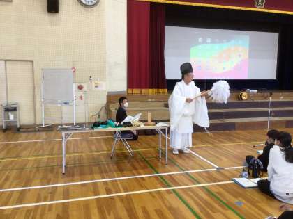 4年生は、社会科「郷土」についての学習で、設楽町田峯に伝わる田峯田楽について教えていただきました。国の重要無形民俗文化財である田峯田楽を映像で見せていただいたり、質問に答えていただいたりして伝統芸能について学びました。
