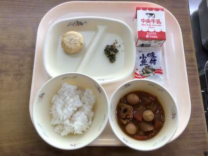 【献立】七草ごはん、牛乳、根菜のみそ煮、豆腐しんじょ、乾燥小魚