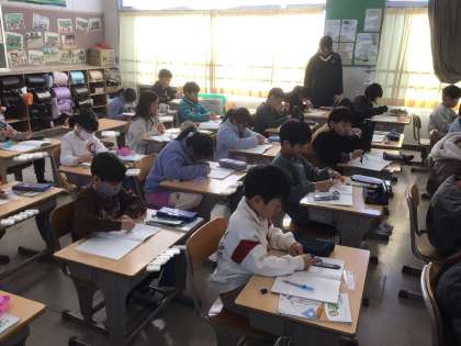 外国語活動では「What's This?」の学習に取り組んでいます。ALTの先生と一緒に、聞いた野菜の絵を描くゲームで楽しく活動していました。