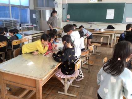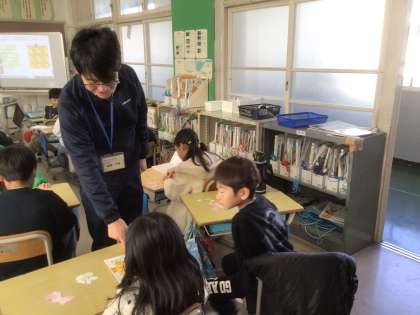 1月19日 学習の様子(2年生) 公開日 2026/01/19 更新日 2026/01/19 校長室から 2年生は、図工で「コロコロぺたぺた」の製作に取り組んでいます。ローラーやスポンジで描いた絵を乾かしている時間に、グループで下絵を見合ったり、絵本を見合ったりして楽しそうに過ごしていました。 算数では、三角形を組み合わせて正方形を作って並べ、近くの席の子同士で見比べていました。