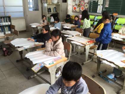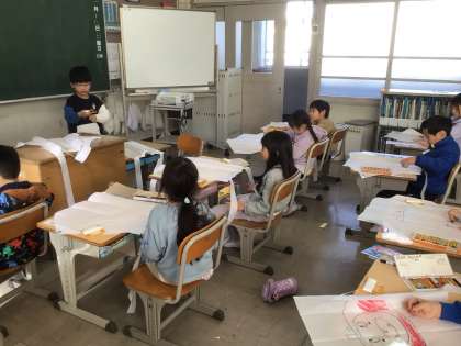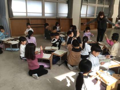1月19日(1年生) 公開日 2026/01/19 更新日 2026/01/19 校長室から 1年生は、音楽でウッドブロックやトライアングルなどの打楽器を使ってリズム打ちをしていました。グループごとに素早く楽器を交代しながら、リズムにのって楽器を鳴らして楽しんでいました。 生活科では、凧を作っていました。自分の凧が空にあがるところを想像しながら、描きたいものを思い思いに描いていました。