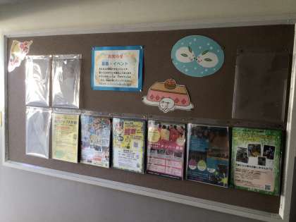 また、市からのイベント情報や地域の活動への参加募集等も掲示しています。チラシがある場合は、興味のある子どもたちが自由に持ち帰ることができるようにしています。