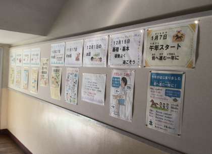 校内には階段や廊下に掲示板がいくつかあります。1棟の掲示板は、主に子どもたちの作品を掲示しています。