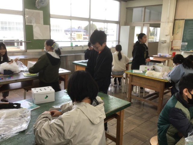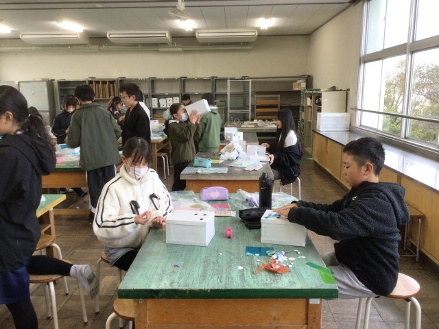 1月29日 図画工作科(5年生) 公開日 2026/01/29 更新日 2026/01/29 校長室から 5年生は、図画工作で「のぞいてみると」という作品製作に取り組んでいます。箱の側面の穴から箱の中をのぞかせてもらうと、とても素敵な仕掛けが広がっていました。出来上がりが楽しみです。