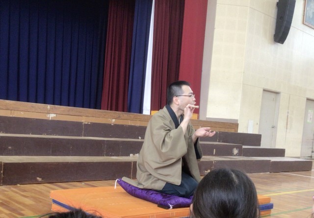 三流亭赤福さんに体育館で落語を聴かせていただきました。たくさんの子が集まり、大笑いしながら楽しみました。