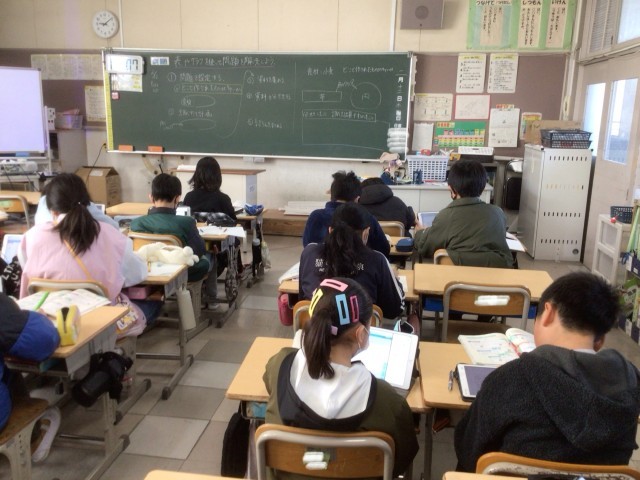 学習用タブレットを使ったり、教え合ったりしながら問題を解いていました。