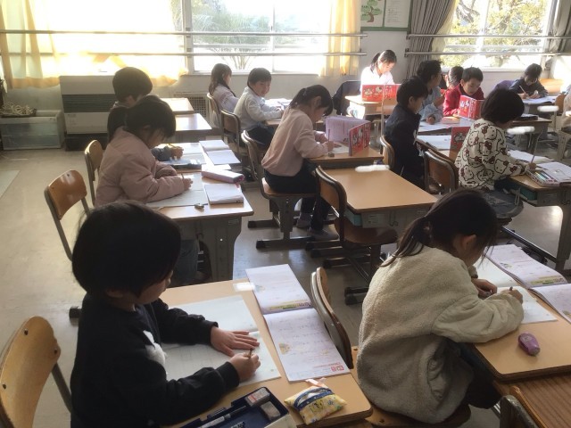 2月13日 学習の様子(1年生) 公開日 2026/02/13 更新日 2026/02/13 校長室から 算数では、数え棒を使いながら、大きな数の計算を考えていました。国語では、漢字ドリルを使って、漢字の練習に励んでいました。生活科では、読み手を交替しながら、グループで楽しくかるたをしていました。