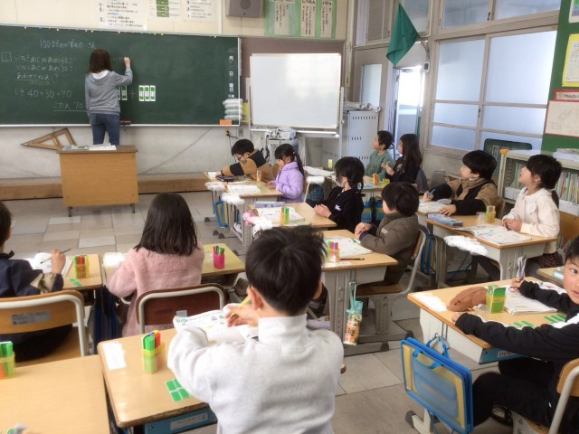 1年生が、算数で「100までの数の計算」の練習をしています。