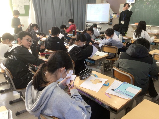 2月19日 算数科(5年生) 公開日 2026/02/19 更新日 2026/02/19 校長室から 5年生は、算数で「円柱と角柱」の学習を進めています。展開図を書いて、円柱を製作して、円柱の特徴をつかんでいました。