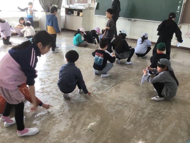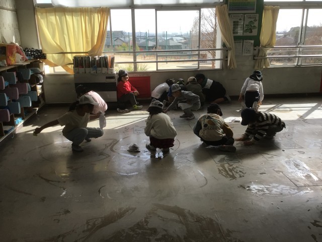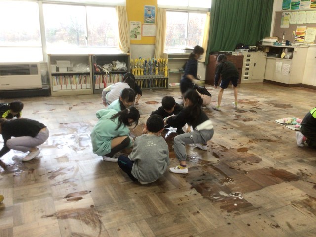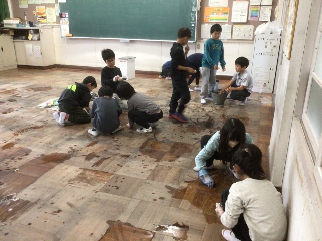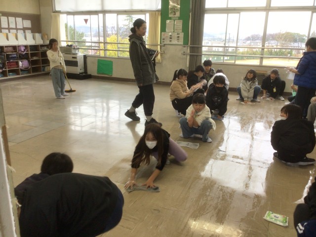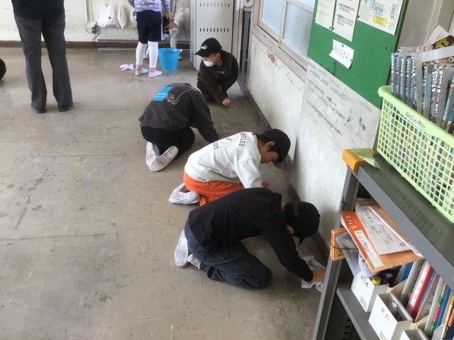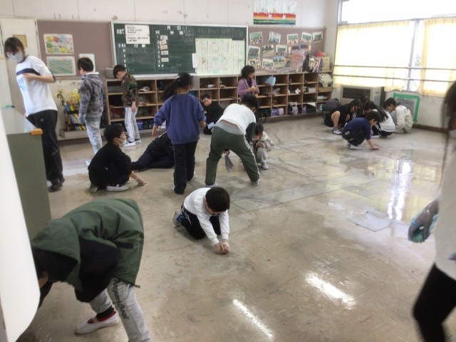 1年間過ごしてきた教室を見渡し、床の汚れを取ったり、床を磨いたりして一生懸命きれいにしていました。