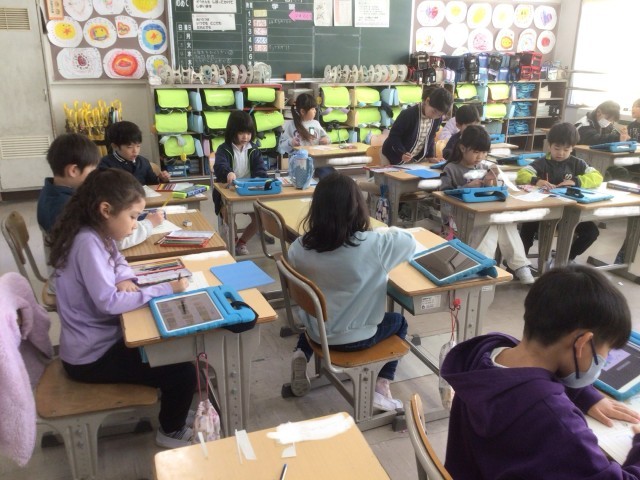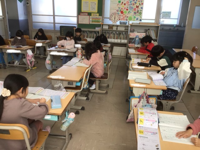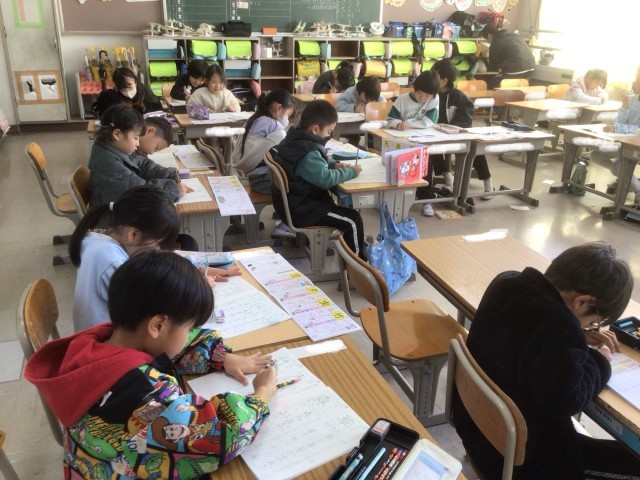 3月4日 学習の様子(1年生) 公開日 2026/03/04 更新日 2026/03/04 校長室から 1年生が、国語の学習で習った漢字の練習をしていました。たくさんの漢字を筆順を確認しながら丁寧に書いていました。生活科では、アサガオの種を入れて来年度の新入生にプレゼントする袋を作っていました。学習用タブレットで自分のアサガオの写真を見ながら、絵を描いていました。 +1