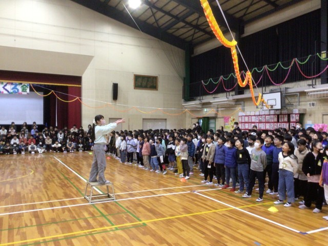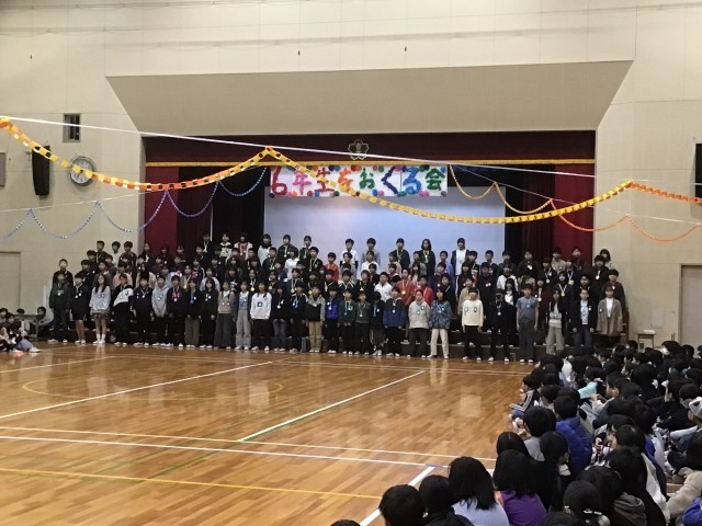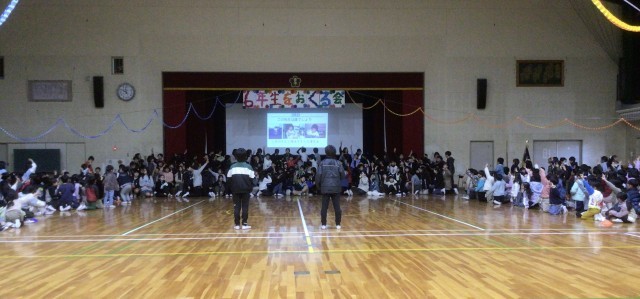 全校児童が体育館に集まり、6年生を送る会を行いました。
