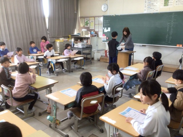 3月17日 たくさん読書をしました(1年生) 公開日 2026/03/17 更新日 2026/03/17 校長室から 学校の図書館から「多読賞」が各学級に届きました。この1年間で、本を何冊借りて読んだかを、各担任が紹介しながら多読賞を渡していました。
