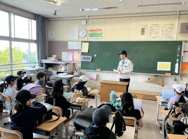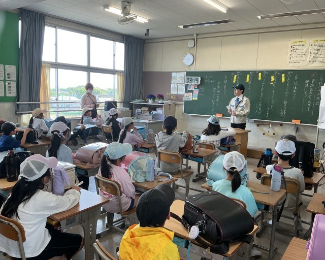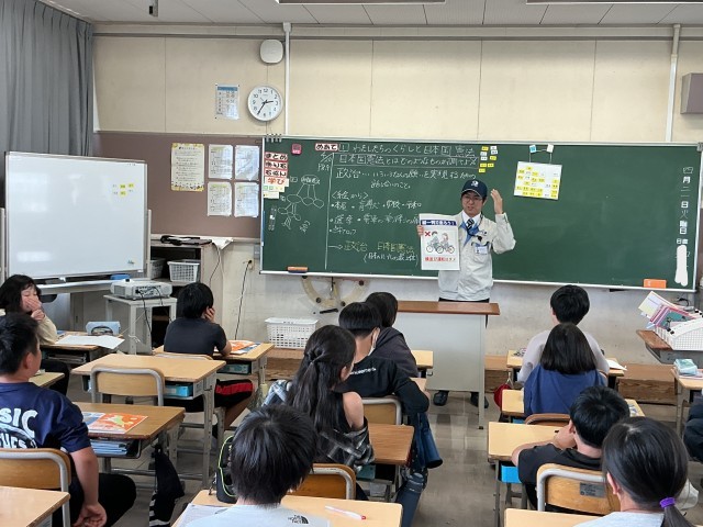 花本町にある「トヨタテクニカルディベロップメント株式会社」の新入社員の方々が今年度も青木小学校に来てくださり、それぞれの方が作成したポスターを使って、子どもたちに交通安全のお話をしてくださいました。
