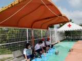 見学者も暑さ対策が必要です。 PTAの協力で、ミストシャワーと足を冷やすための桶を設置しました。 これでも足りないぐらいの暑さのときは、室内で学習します。