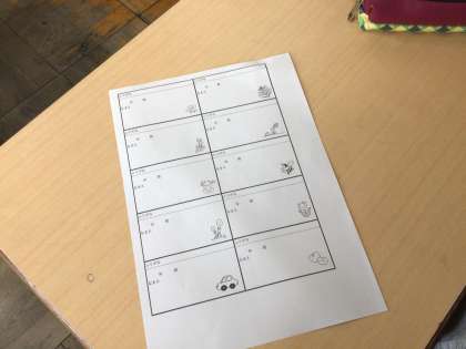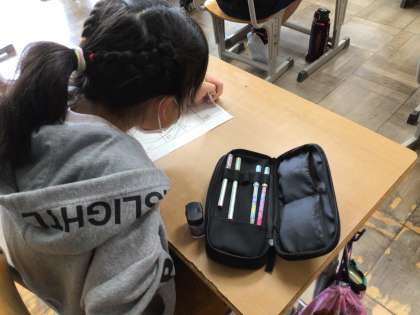 誕生会に向け、同じ班になった子たちに渡す名刺を作っています。