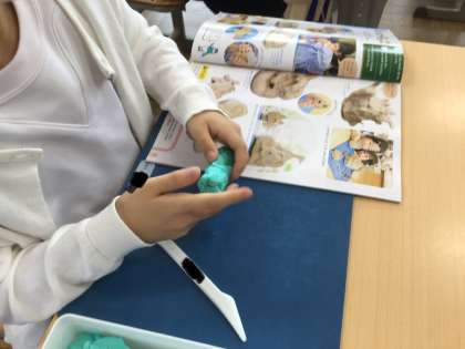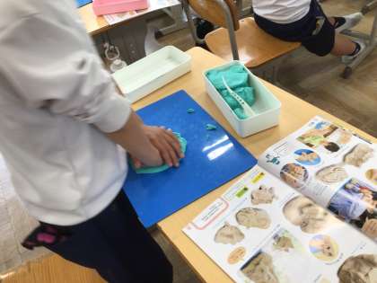 2年生の図工では、にぎにぎねんどという単元で、粘土の握り方を変えてできたものを重ねて作品を作っています。