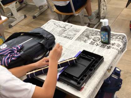 毛筆の学習を進めていくために、習字道具の使い方を確認しました。