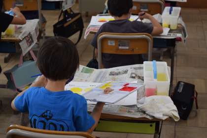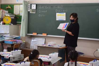 1年生の教室で、絵の具セットの使い方を学習していました。
