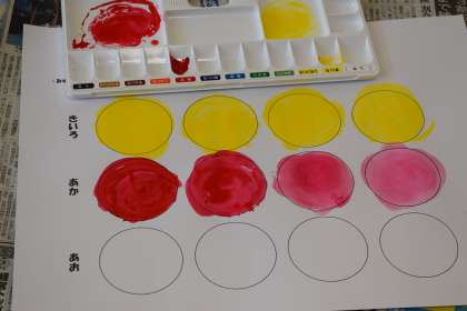 赤・黄・青色の絵の具をパレットの小さな部屋に出して、水を加えながら広い部屋でのばして、丸の中を色塗りしました。少しずつ水を加えて変化を出していました。